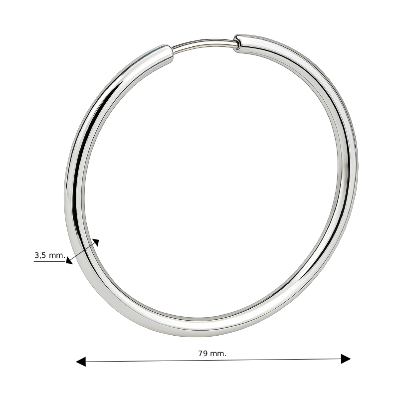 Elegantne srebrne alka minđuše izrađene od srebra finoće 925. Okruglog oblika, širine 79 mm i debljine 3,5 mm, sa visokim sjajem i savršenom završnom obradom. Klasičan i prefinjen dizajn koji nikada ne izlazi iz mode.
