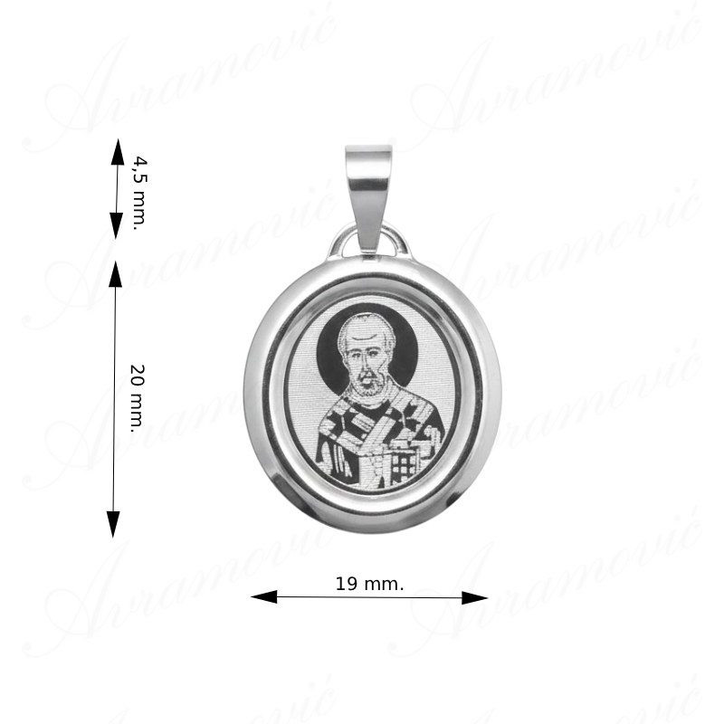 Privezak od srebra finoće 925 sa likom Svetog Nikole, čudotvorca i zaštitnika. Ikona simbolizuje nesebičnost i pomoć. Privezak je izrađen od rodiniranog srebra za postojan blistav sjaj i otpornost na tamnjenje. Idealan je za nošenje uz lančić ili kao poklon za krsnu slavu. Duhovni simbol zaštite putnika i svih kojima je pomoć potrebna.