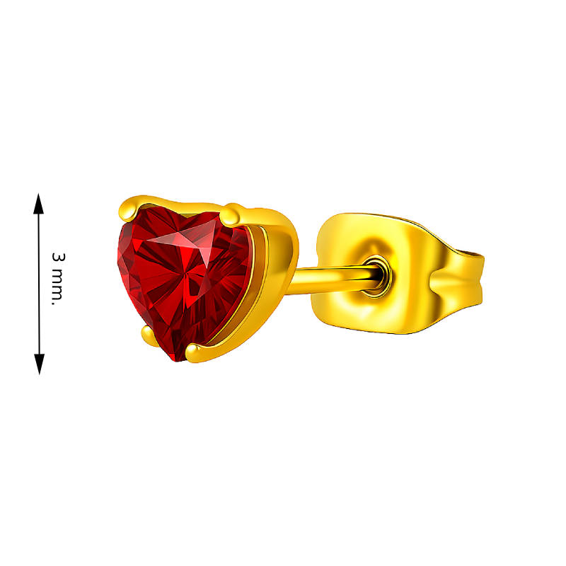 Jedna elegantna minđuša od hirurškog čelika u zlatnoj boji sa rubin crvenim sintetičkim dijamantskim kamenom veličine 3 mm. Sjajna, postojana i antialergijska — savršen izbor za svakodnevno nošenje ili kao poklon sa značenjem.