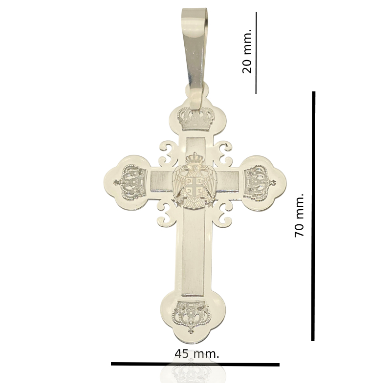 Ovaj elegantni pravoslavni krst je unikatni primer ručne izrade i posvećenosti detaljima. Izrađen od visokokvalitetnog srebra, krst je dimenzija 70 mm x 45 mm, sa alkicom dužine 20 mm. Posebnu lepotu mu daju ručno nitovane krune i detaljan srpski grb u centru, što ga čini snažnim simbolom vere, tradicije i nacionalnog identiteta. Ovo je idealan komad nakita za sve koji cene duhovnu simboliku i vrhunsku zanatsku izradu.