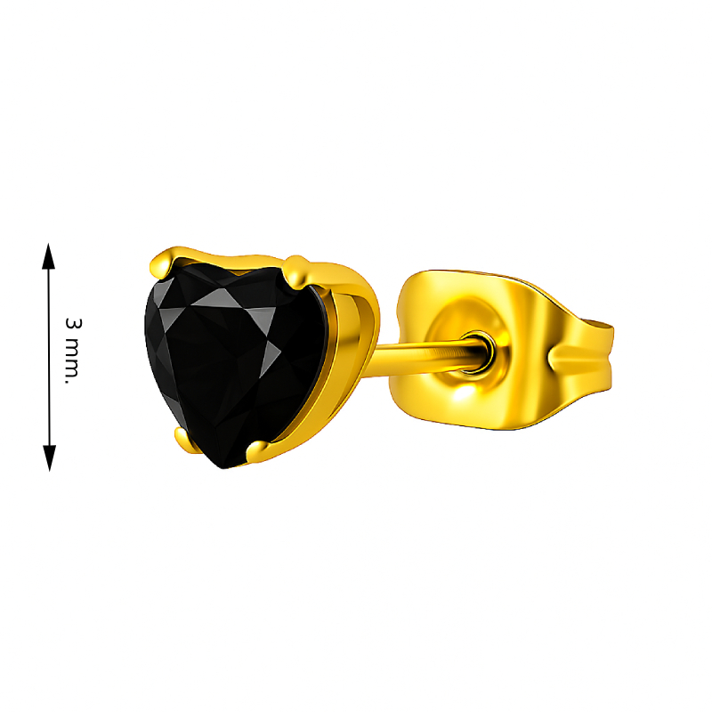 Jedna elegantna minđuša od hirurškog čelika u zlatnoj boji sa crnim sintetičkim dijamantskim kamenom veličine 3 mm u obliku srca. Postojana, antialergijska i sjajna – savršen izbor za moderan, sofisticiran izgled sa dozom mističnosti.