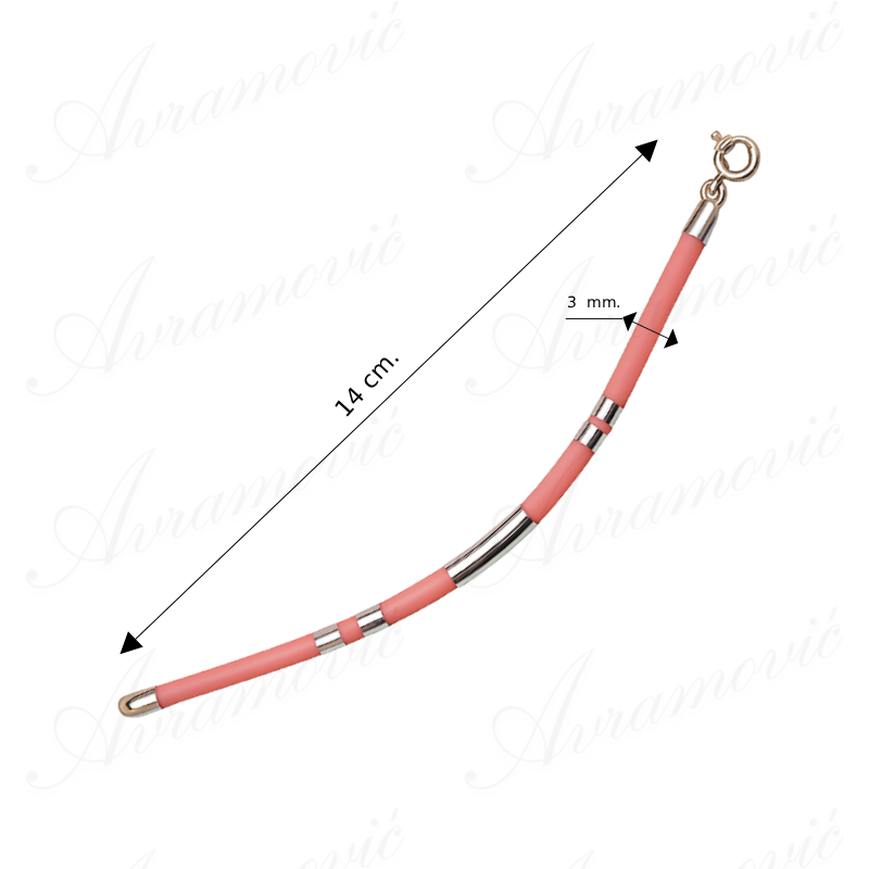 Dečija pink narukvica od kvalitetnog kaučuka sa srebrnim elementima finoće 925. Mekana, lagana i udobna za svakodnevno nošenje. Dužina 14 cm, širina 3 mm. Idealna kao poklon i savršena za mališane koji vole nežne, moderne detalje.