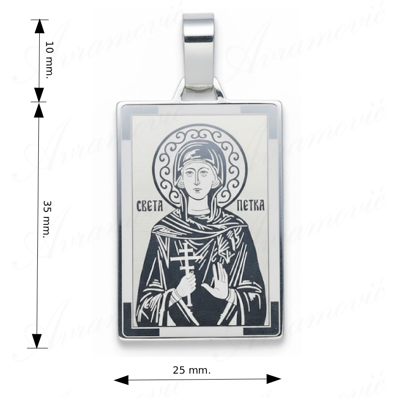 Elegantan privezak od srebra finoće 925 sa detaljnim prikazom Svete Petke. Pažljiva izrada ističe sveti lik, čineći ga posebnim simbolom vere. Privezak je rodiniran, što mu daje izuzetan blistav sjaj i otpornost na tamnjenje. Idealan je za nošenje uz lančić ili kao poklon za drage osobe. Trajan znak vere i elegantan detalj.